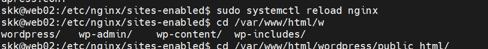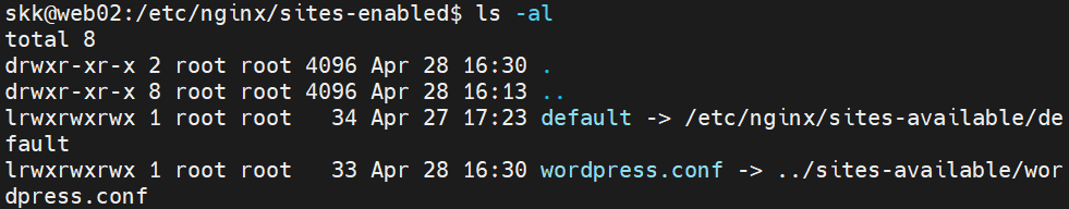 $ sudo ln -s ../sites-available/wordpress.conf . (sites-available경로에 있던 wordpress.conf파일을 심볼릭 링크)