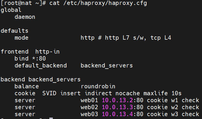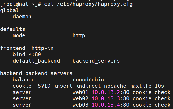* default_backend 명령어 뒤의 backend_servers(그룹명)는 frontend의 80번 포트로 접근하면 backend_servers(backend에 정의된 이름)로 연결해달라는 뜻