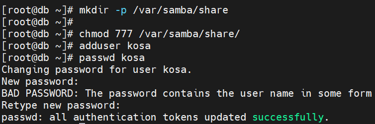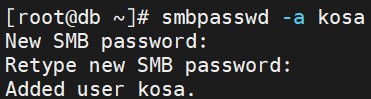 * 리눅스에서 kosa 사용자를 생성하고, 해당 유저를 samba에서 이용할 수 있도록 samba에서 이용하는 passwd설정