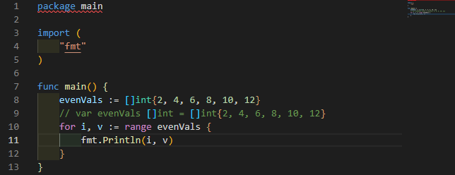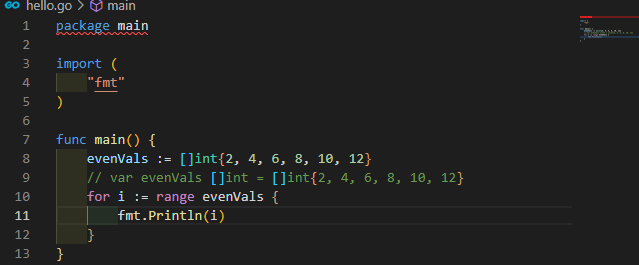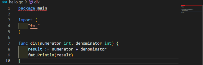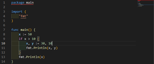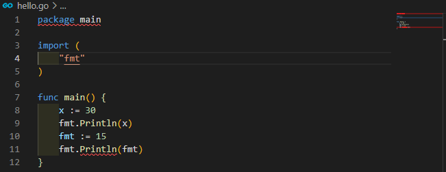 * fmt가 지역변수로써 기능하게 되면, 파일블록에서 fmt 패키지를 섀도잉하여 main함수에서 fmt패키지 사용이 불가
