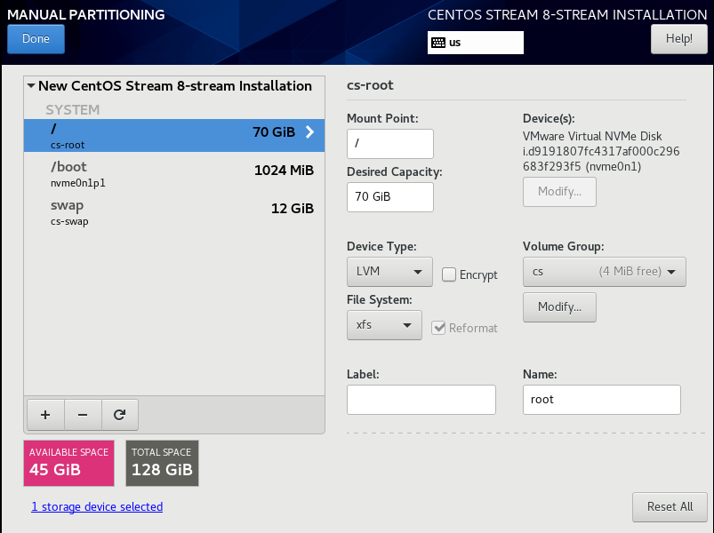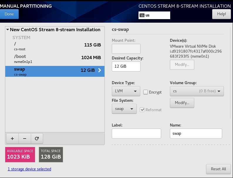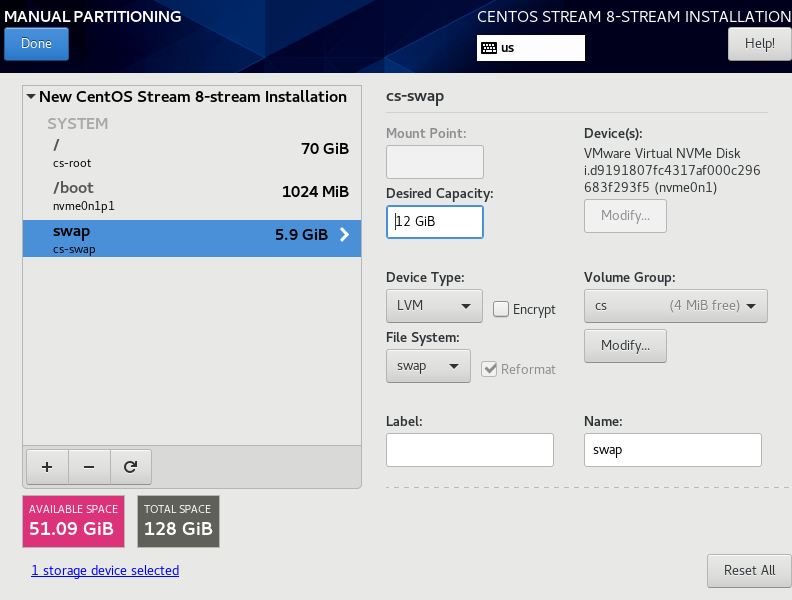 * swap은 잡아놓은 메모리(12GB)의 반 정도를 swap으로 잡게 됨( 메모리 공간을 전부 사용할 시 부족한 부분을 처리하겠다는 의미의 swap 공간)