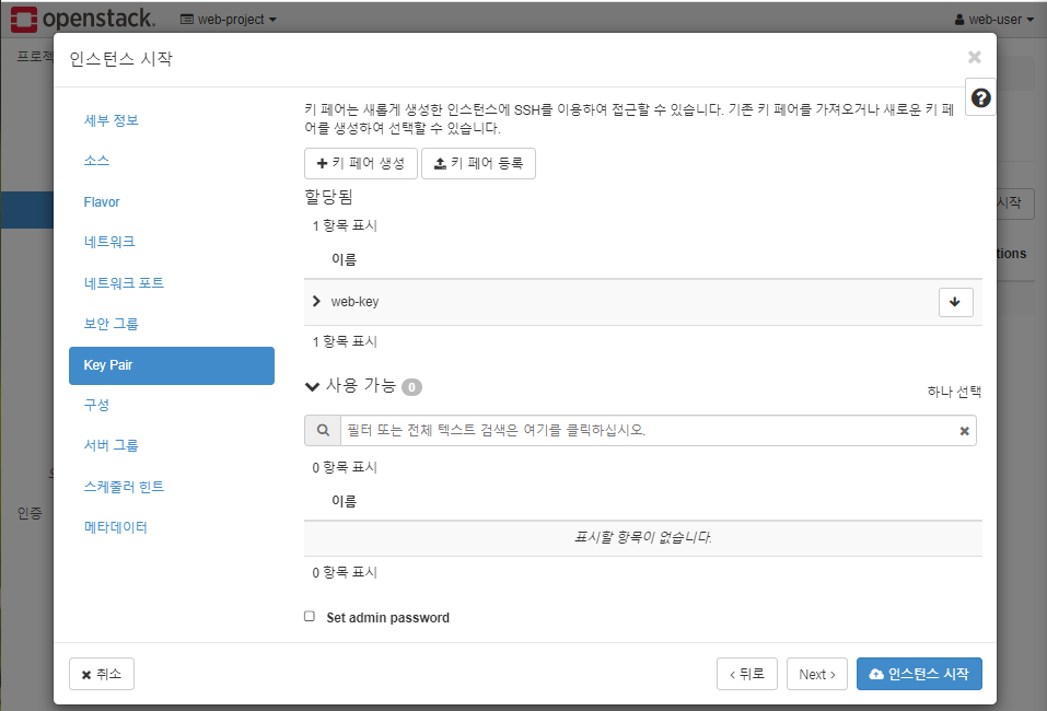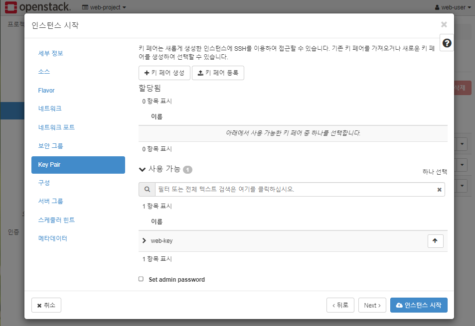 * 새로운 키 할당하고 바로 인스턴스 시작 클릭