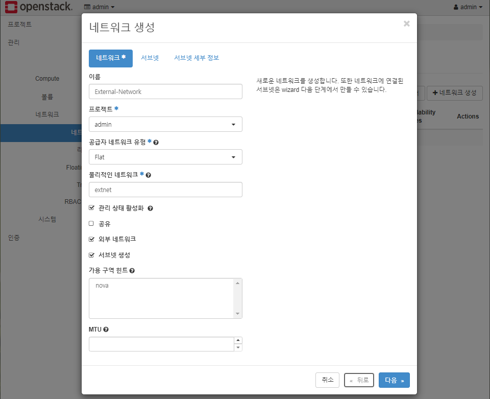 * CONFIG_NEUTRON_OVS_BRIDGE_MAPPINGS=extnet:br-ex -> flat을 설정할 때 외부인터페이스