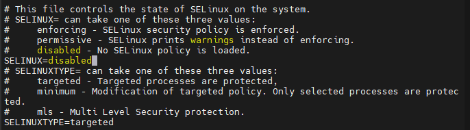 -> sed -i 's/^SELINUX=enforcing$/SELINUX=disabled/' /etc/selinux/config