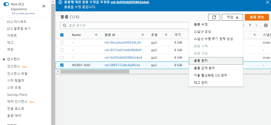 * 볼륨 분리하고 다시 WEB02에 붙이려고 해도 가용영역이 달라서 불가능