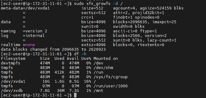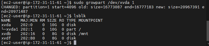 * sudo growpart /dev/xvda 1 : 파티션 1번을 만들어줌