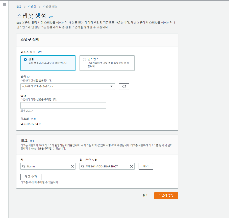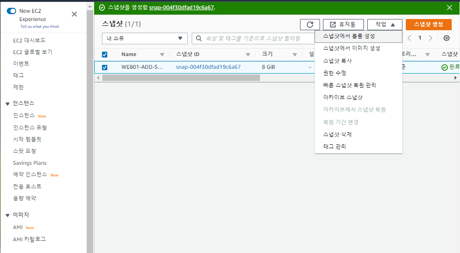 * 스냅샷에서 이미지 생성 : 루트 볼륨에 OS가 담겨 있으니까 루트 볼륨의 스냅샷이어야 함