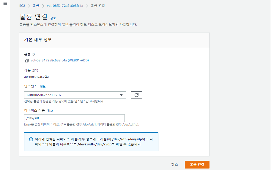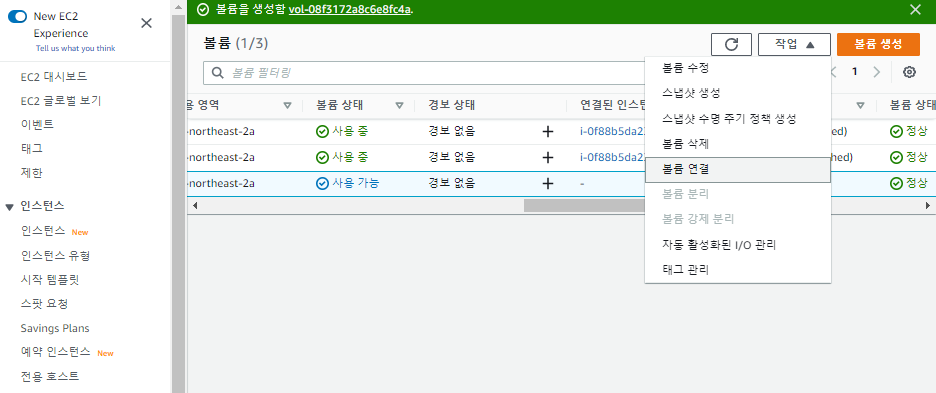 * 볼륨 연결이 활성화 안 되어 있다면 EC2와 EBS의 가용영역이 다른 것은 아닌지 확인해 보기