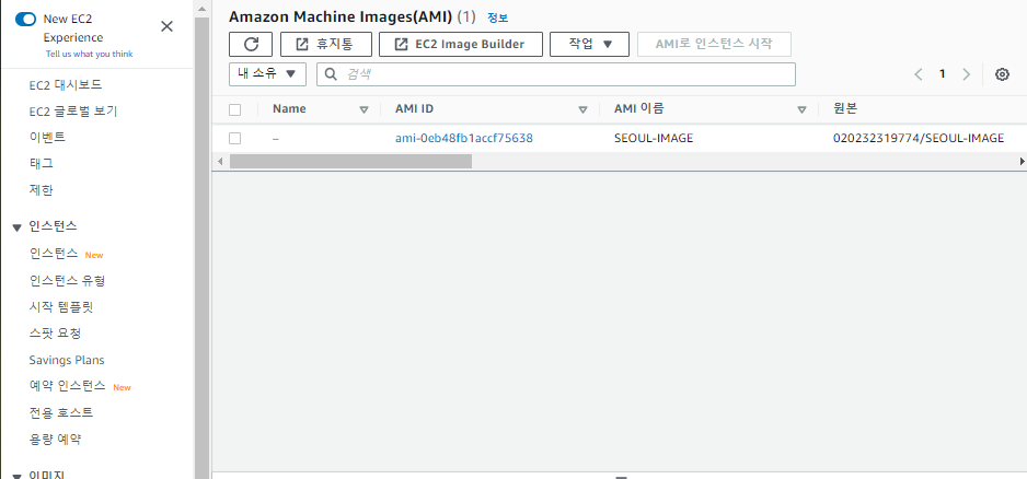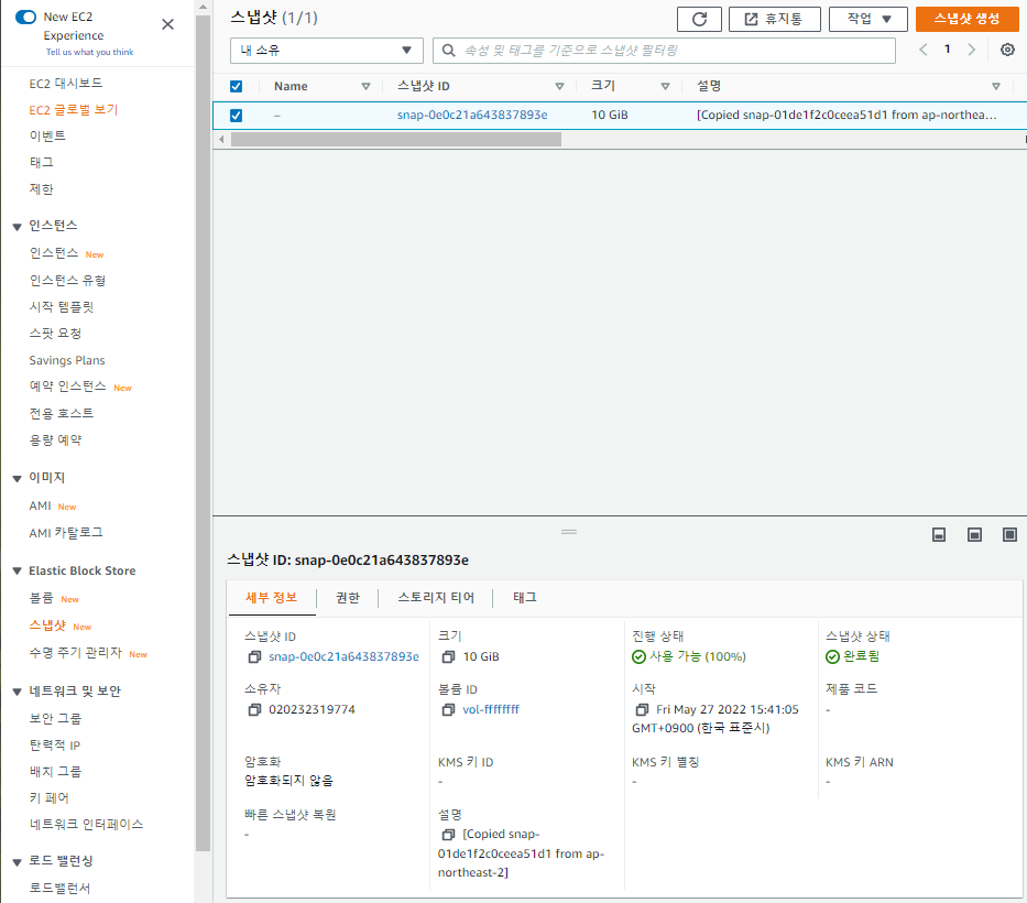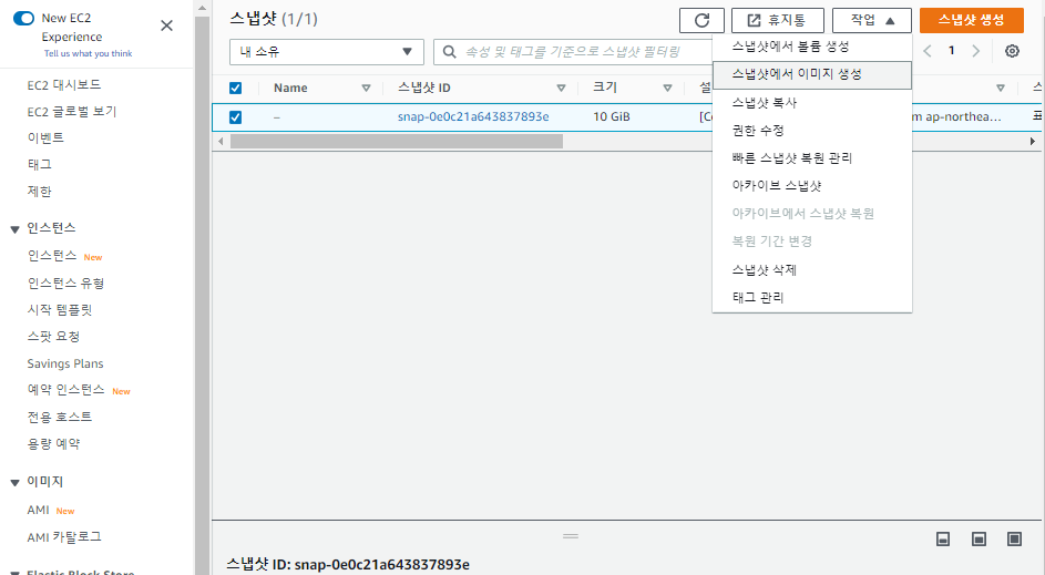 * 서울 리전에서 도쿄 리전으로 루트 볼륨의 스냅샷을 가져왔으니 이제 이미지 생성하기