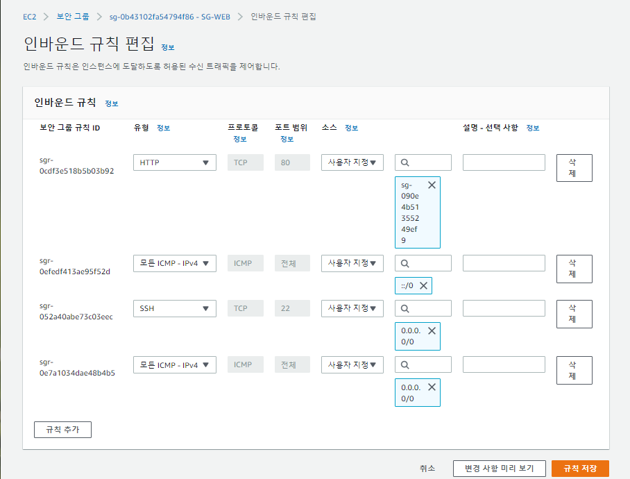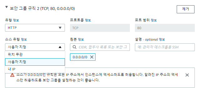 * 소스 유형 정보에서 위치 무관하거나 원본(src)에 0.0.0.0/0 해주거나 둘 다 상관없음