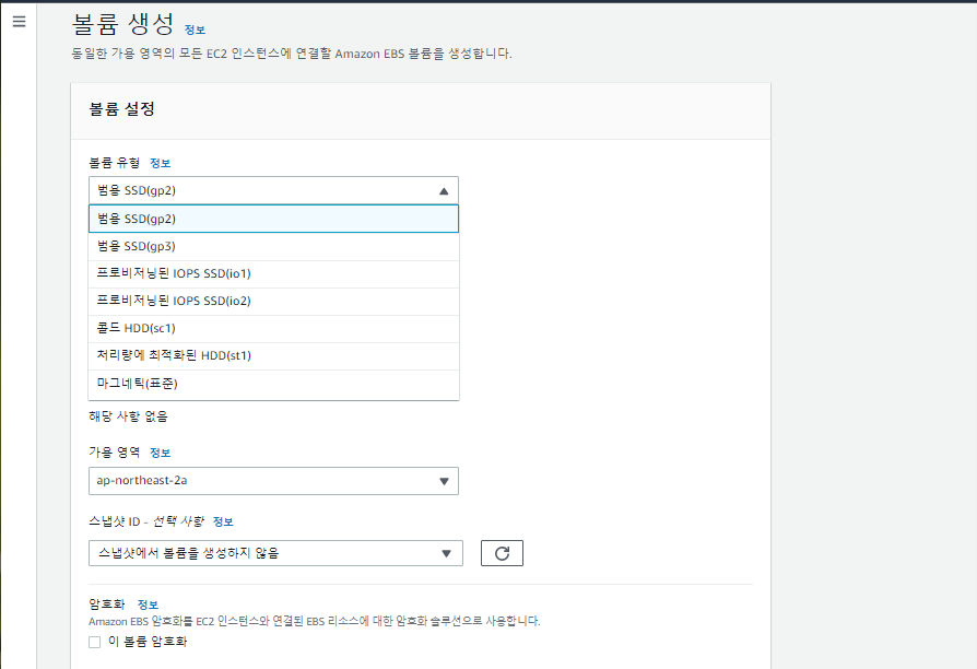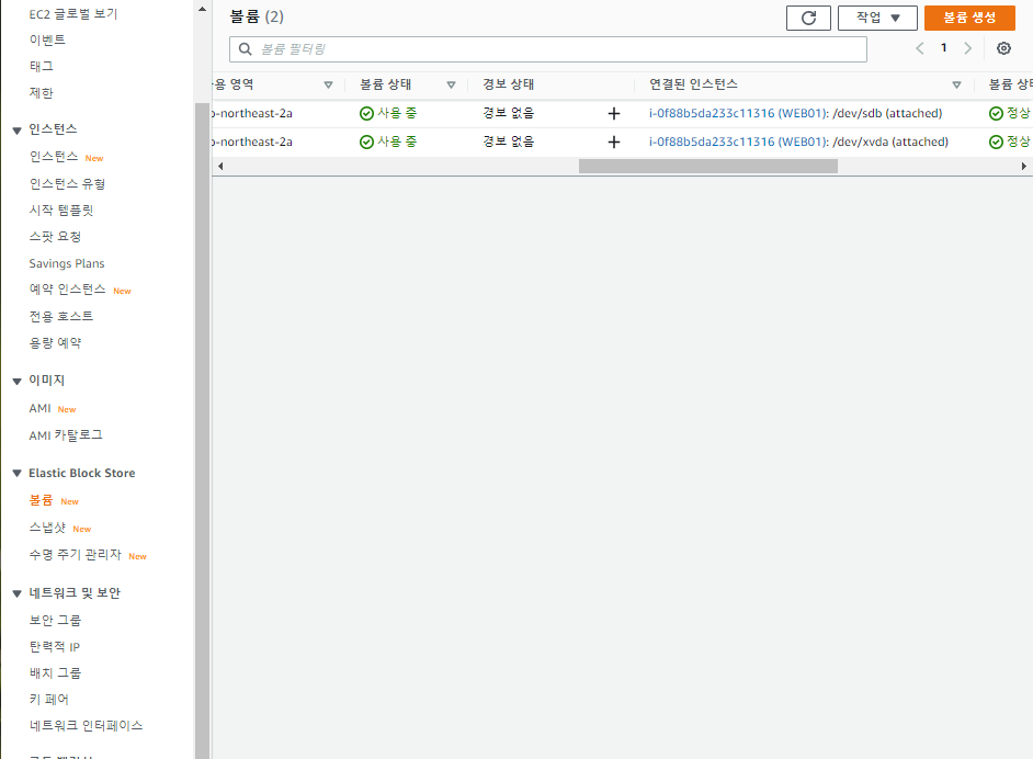 * 볼륨 생성 화면에서 가용 영역을 선택할 수 있음, WEB02는 2에 있으므로 2c를 선택
