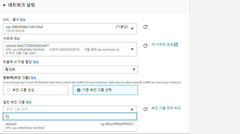 * 보안 그룹도 리전 별로 구분되어 있어서 도쿄 리전에서는 서울리전에서 만든 보안그룹이 보이지 않음