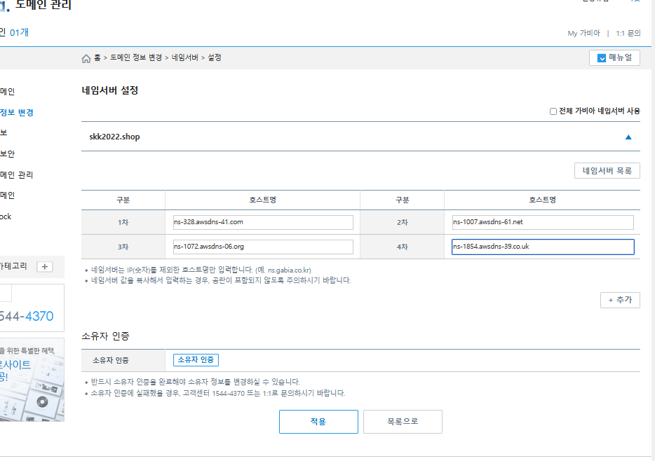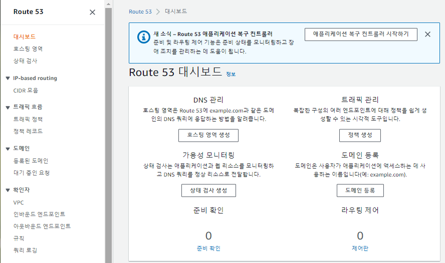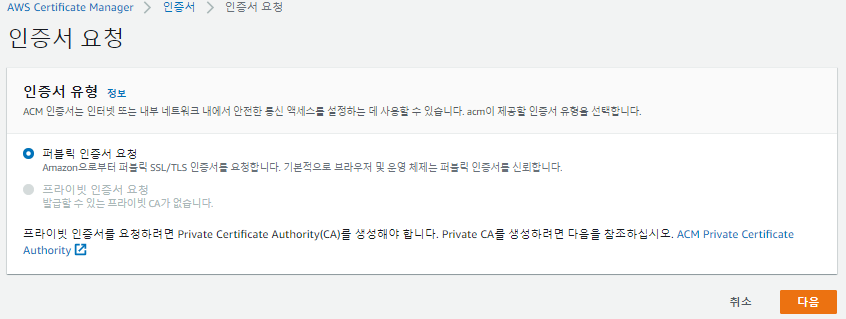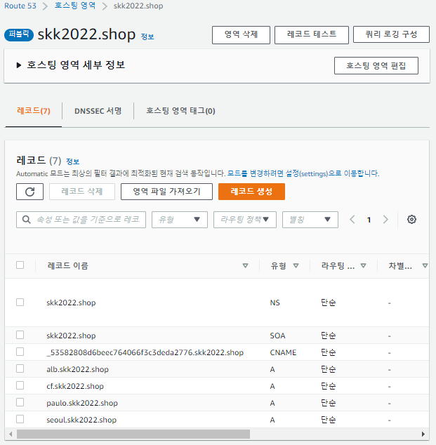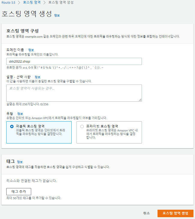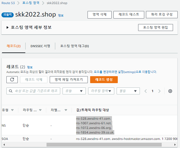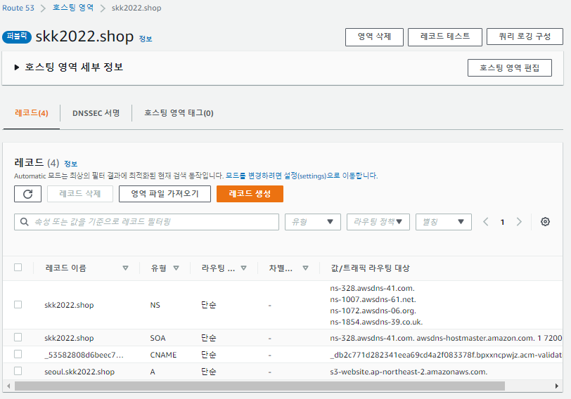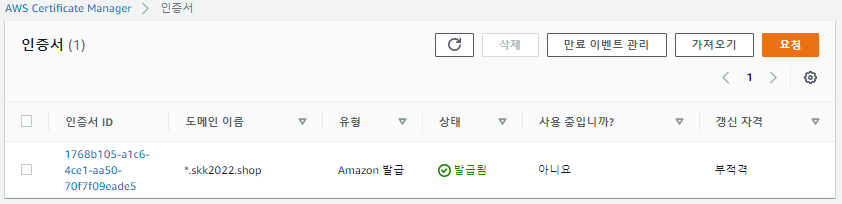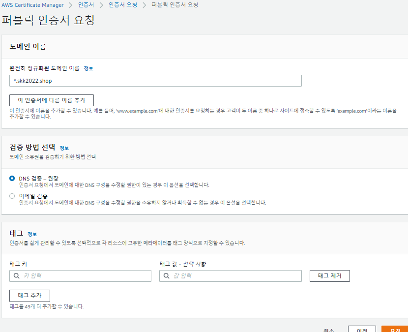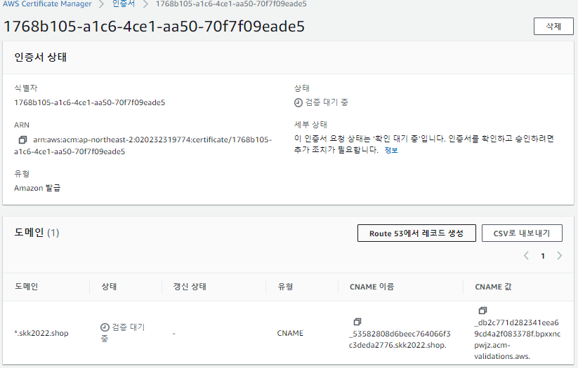 * DNS검증 : Route 53에 도메인 네임을 셋팅 해놓았기 때문에 거기에 도메인 네임에 대한 검증을 요청