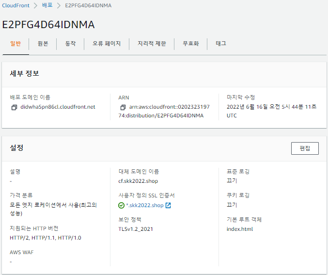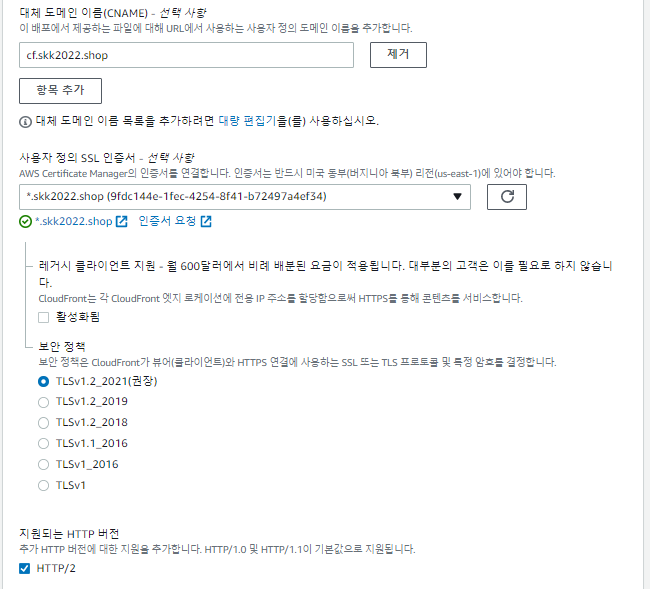 * cloud front는 글로벌 서비스로 버지니아 북부 리전에서 만든 것만 이용할 수 있음