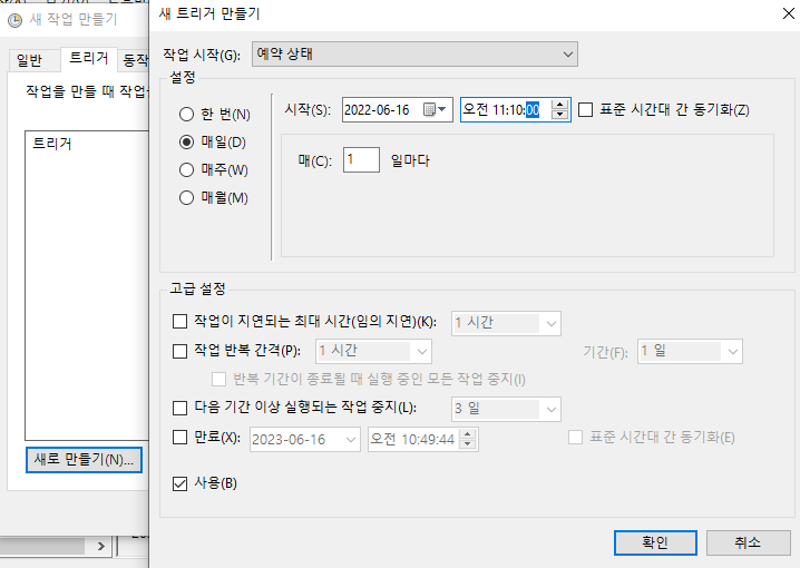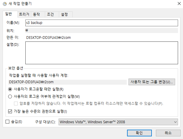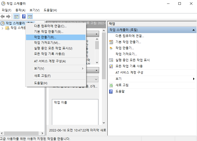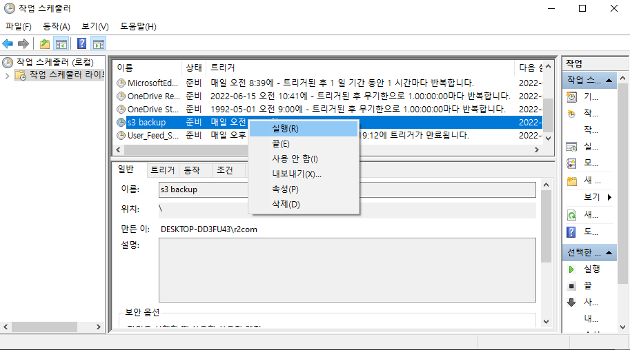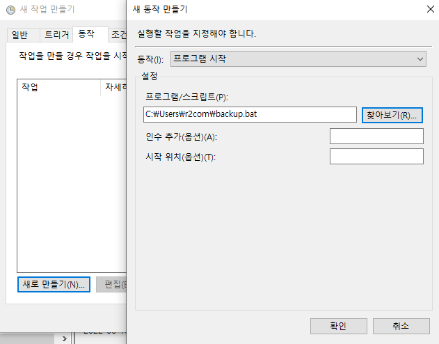 * 윈도우 작업 스케쥴러에 backup.bat파일을 등록하기, 작업 스케쥴러가 셋팅된 배치 파일을 주기적으로 실행시킴