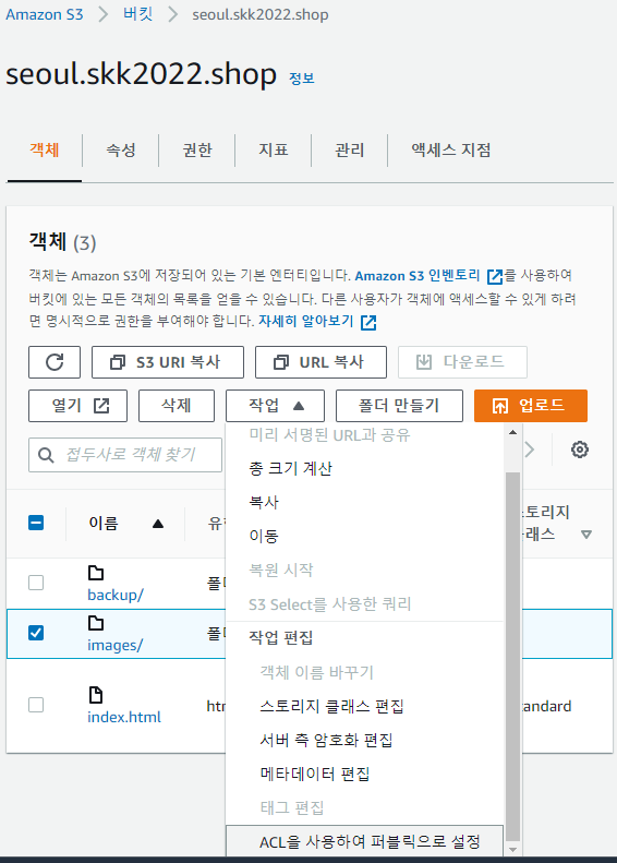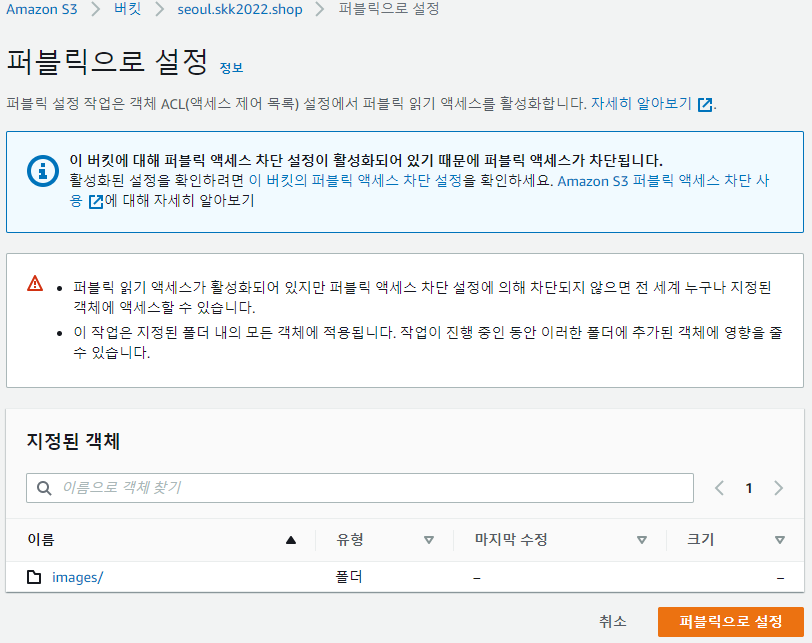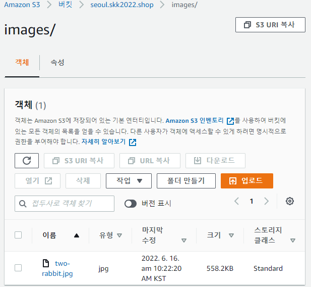 * 버킷에 images라는 폴더를 만들지 않았더라도, 명령어에서 지정하면 해당 폴더를 만들면서 파일을 해당 폴더에 넣어줌