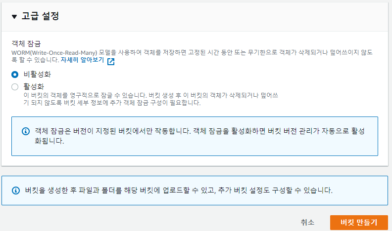 * ACL 비활성화 됨 : 실수에 의한 데이터 오픈까지 봉쇄하는 폐쇄적인 방식 , 소유자만 사용할 수 있어서 다른 유저에게 파일을 공유하려고 해도 퍼블릭 엑세스 설정 자체를 불허함