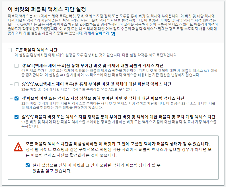 * 모든 퍼블릭 엑세스 차단 : 실수로 누군가에게 파일을 오픈했을 때를 대비하여 모든 퍼블릭 엑세스 차단