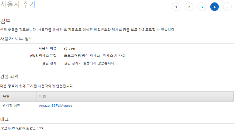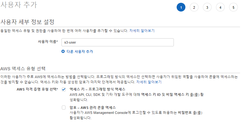 * S3fullaccess : 일반 사용자를 만든 후 S3 한 가지 서비스에 대한 권한 부여