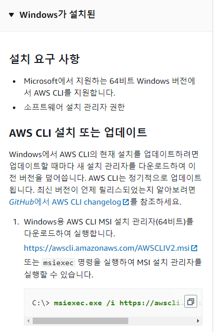 구글에 aws cli 검색 -> CLI설치 업데이트 및 제거 클릭 -> AWSCLI2.msi 파일 다운로드