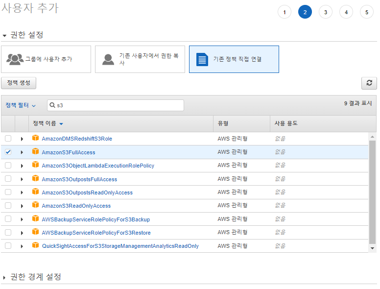 * 기존 정책 직접 연결 : 권한을 직접 부여하는 것 (실습환경에서는 s3fullaccess를 부여)