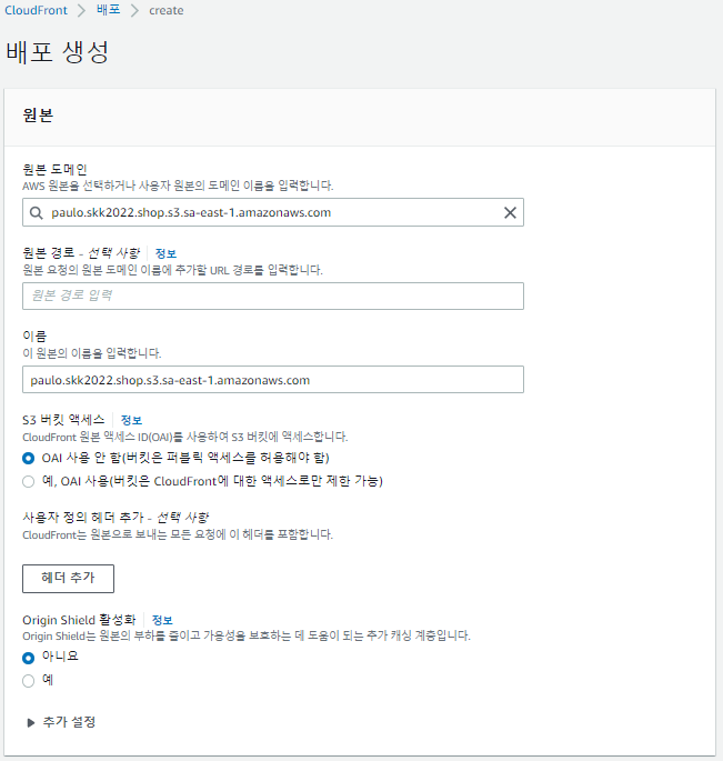 * OAI 사용 : cloud front 엣지 로케이션을 통해서만 상파울로 s3 버킷에 접근할 수 있도록 함, 직접 s3주소로 접속X