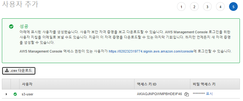 * AWS Access Key ID와 AWS Secret Access Key는 csv파일에서 가져오기