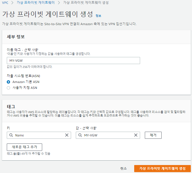 * Customer gateway : 내 아이피 검색했을 때 나오는 IP를 유일한 퍼블릭ip로 사용