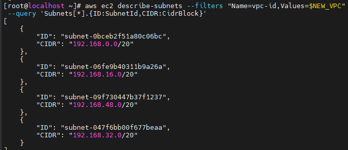# aws ec2 describe-subnets --filters "Name=vpc-id,Values=$NEW_VPC" --query 'Subnets[*].{ID:SubnetId,CIDR:CidrBlock}'