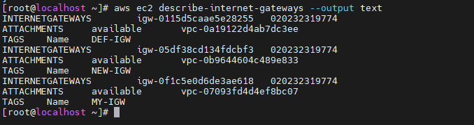# aws ec2 create-internet-gateway --tag-specification "ResourceType=internet-gateway,Tags=[{Key=Name,Value=NEW-IGW}]" --output text