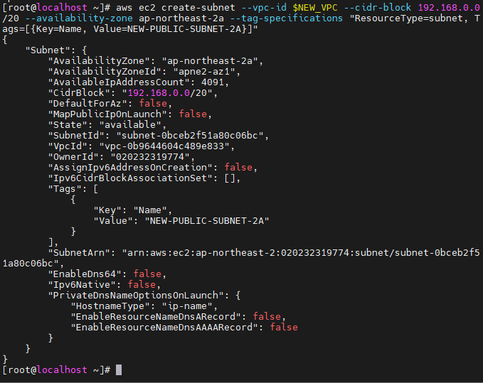 # aws ec2 create-subnet --vpc-id $NEW_VPC --cidr-block 192.168.0.0/20 --availability-zone ap-northeast-2a --tag-specification "ResourceType=subnet,Tags=[{Key=Name,Value=NEW-PUBLIC-SUBNET-2A}]"