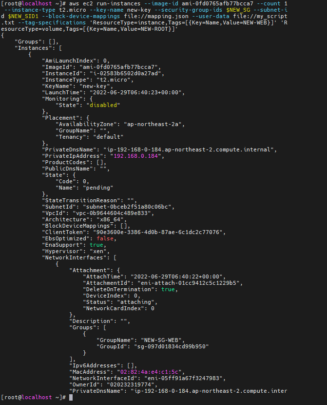 # aws ec2 create-vpc --cidr-block 192.168.0.0/16 --tag-specification "ResourceType=vpc,Tags=[{Key=Name,Value=NEW-VPC}]" --output text  => ec2가 먼저 탄생해서 vpc를 생성하는 명령어가 ec2 뒤에 오게 됨