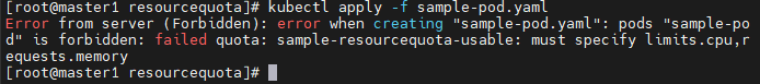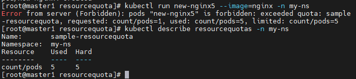 # kubectl apply -f sample-resourcequota.yaml my-ns 네임스페이스에 apply된 리소스쿼터 확인 # kubectl describe resourcequotas sample-resourcequota # kubectl run pod new-nginx --image=nginx pod가 다섯 개를 초과하려고 하면 애러 발생