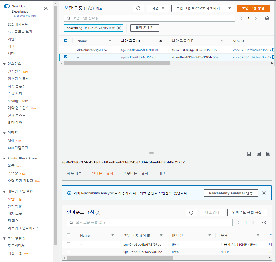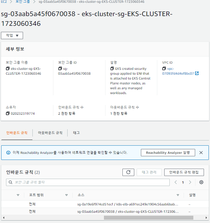 보안 그룹 소스에 자기 자신을 셋팅하지 않고 ICMP 프로토콜을 허용해도 되지만, 이렇게 하게 되면 새로운 포트가 추가될 때마다 일일이 보안 그룹을 편집해야하므로 자기 자신을 소스로 하는 인바운드 규칙을 만듦
