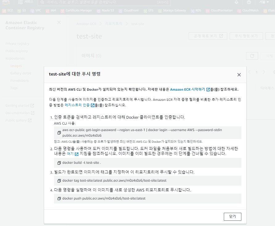 => 만약 aws configure를 먼저 하지 않으면 인증 토큰 검색과 레지스트리에 대한 도커 클라이언트 인증 애러 발생