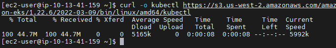 $ curl -o kubectl https://s3.us-west-2.amazonaws.com/amazon-eks/1.22.6/2022-03-09/bin/linux/amd64/kubectl